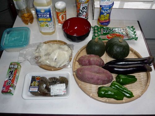 工房での昼食は暖かい物を食べたくなりました。野菜天ぷらを揚げて天丼に、温かい蕎麦に天ぷらを乗せて天ぷらそばとします。 天ぷらの食材は自家製のサツマイモ、カボチャとスーパーマーケットで買ったバナメイエビ(ペルー産)やナス、ピーマンなどを使います…