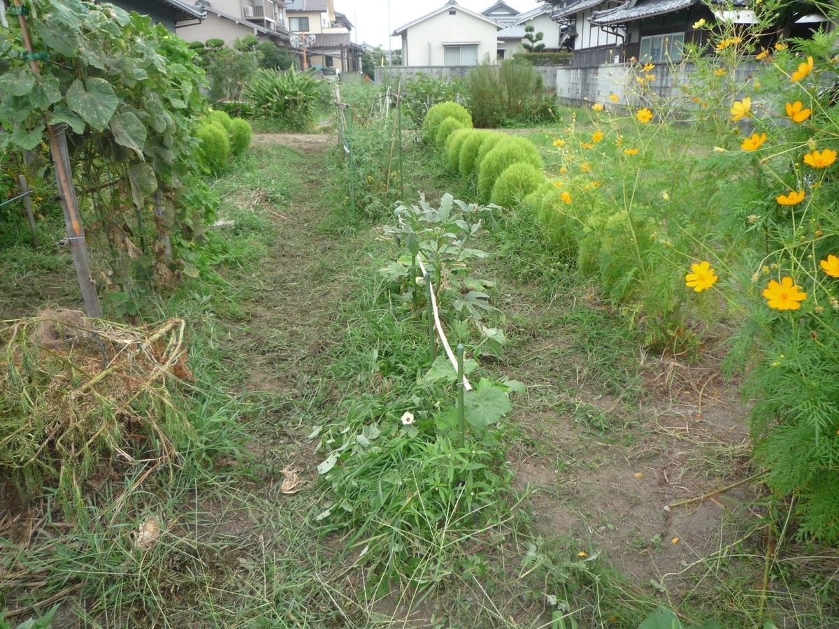 キャベツを植える予定の場所。 通路は草で埋もれて歩きづらい。