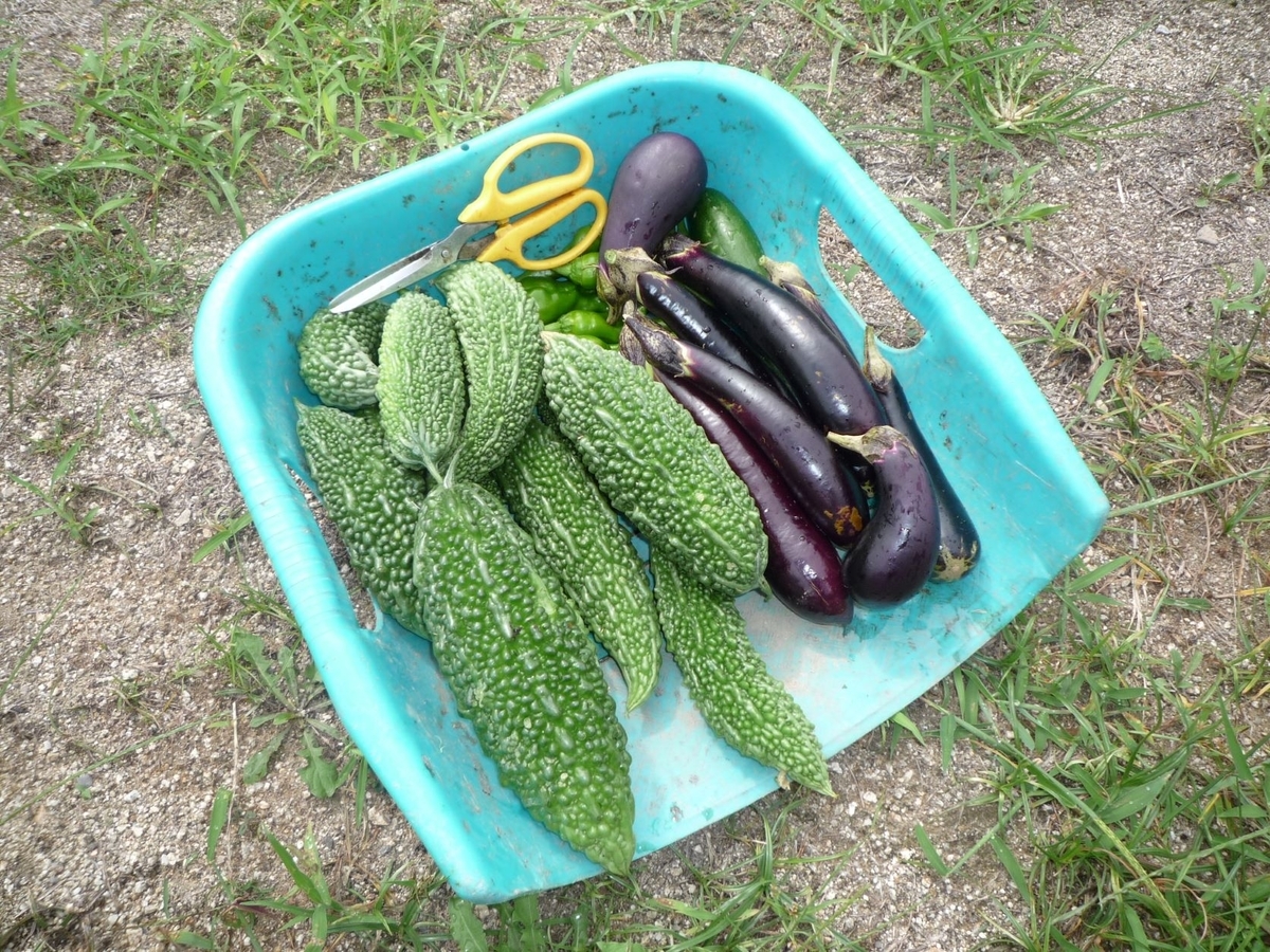 草刈り後、収穫をしました。 ゴーヤはまだたくさん取れています。ナスはこれからは小形になりますが、しばらく収穫できます。ピーマンや、シシトウもしばらく収穫出来ます。