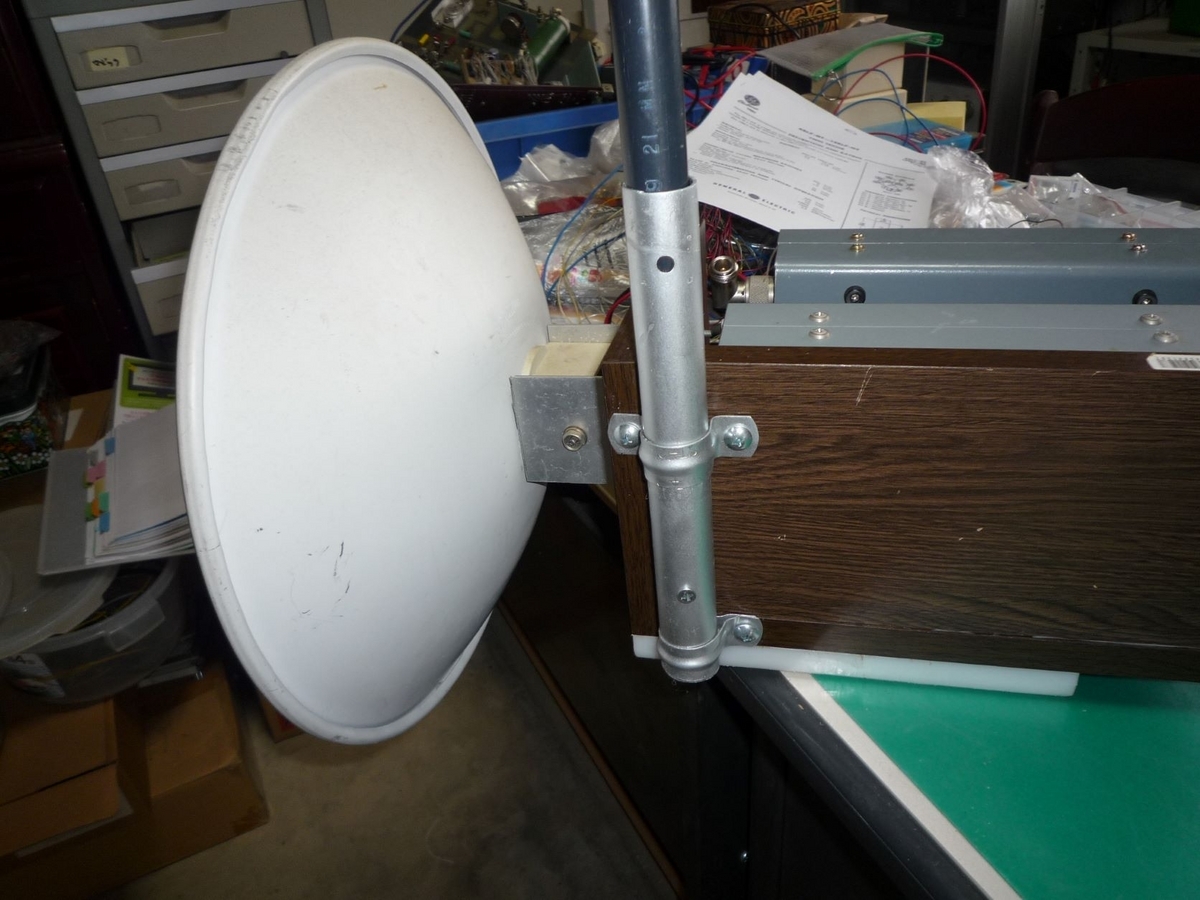 木製の基台の片隅に、2400MHzのアンテナを取り付けるマストの挿入部(30mmのアルミパイプ)をサドルで取付ました。