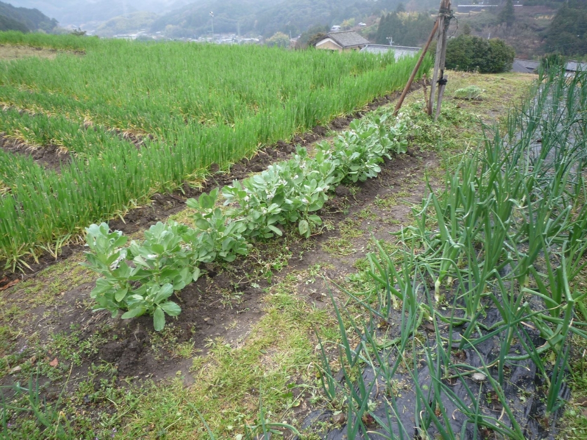 工作工房の畑でも春の農作業が始まりました。昨年秋に植えていた玉ねぎやそら豆、麦の雑草取りと、追肥・土寄せを行いました。