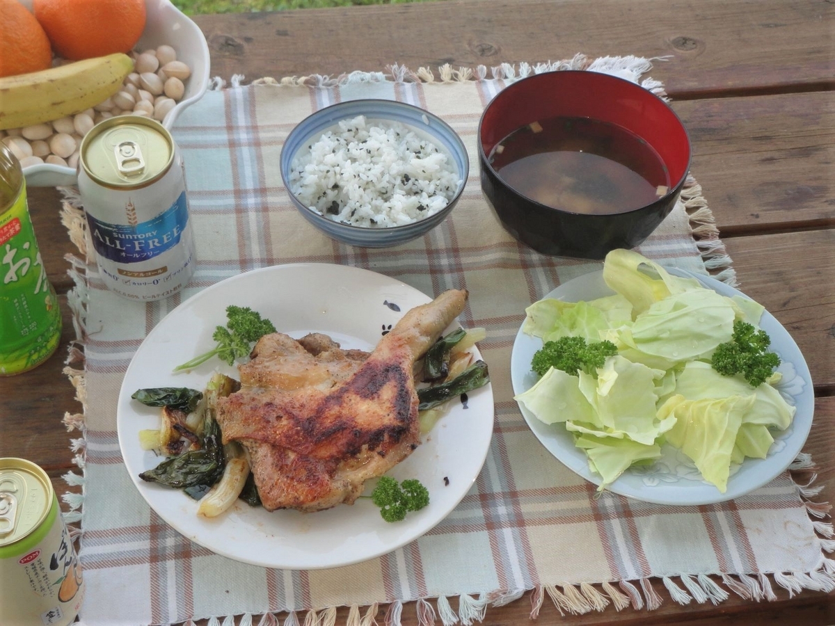 丸亀名物の焼鳥を食べたくてスーパーマーケットで探していると2割引きの骨付き鶏のパックが売られていたので早速買って工房での昼食で調理し、美味しく頂きました。