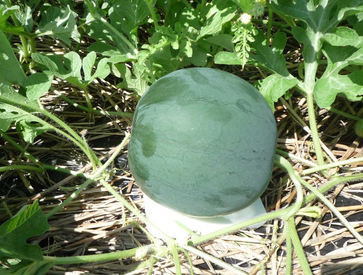 これは種無しスイカの「ブラックジャック」です。表皮が濃い緑色をしています。果汁マットを敷いていて、元気に成長中です。