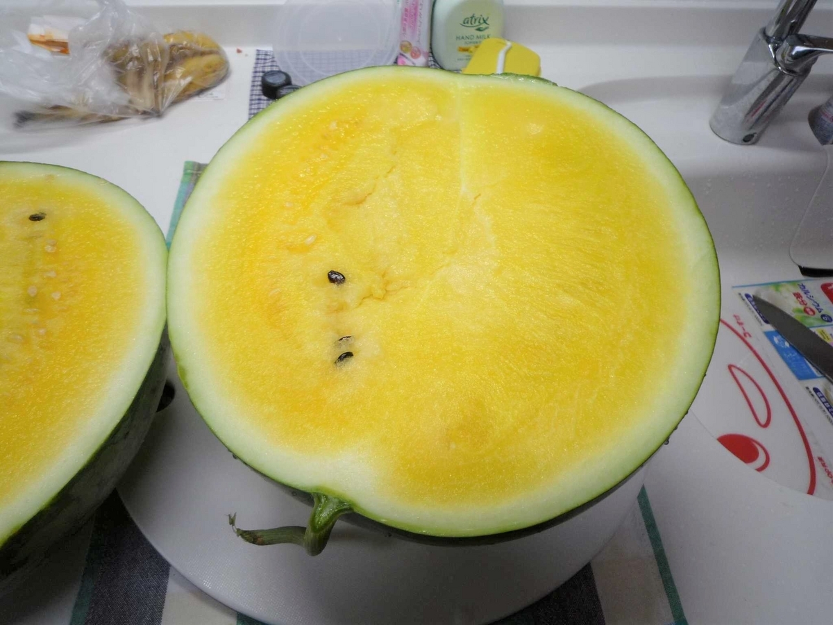 自宅に持ち帰り、嫁さんに自慢した後、真っ二つに切りました。 鮮やかな黄色です。種が少ないのに驚きです。