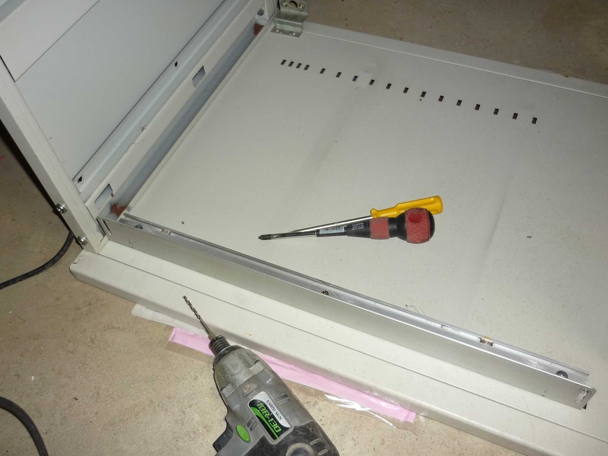 アルミのLアングルをキャビネットの全面から少し奥で垂直に固定します。 5ミリのビスで頑丈にタッピングします。