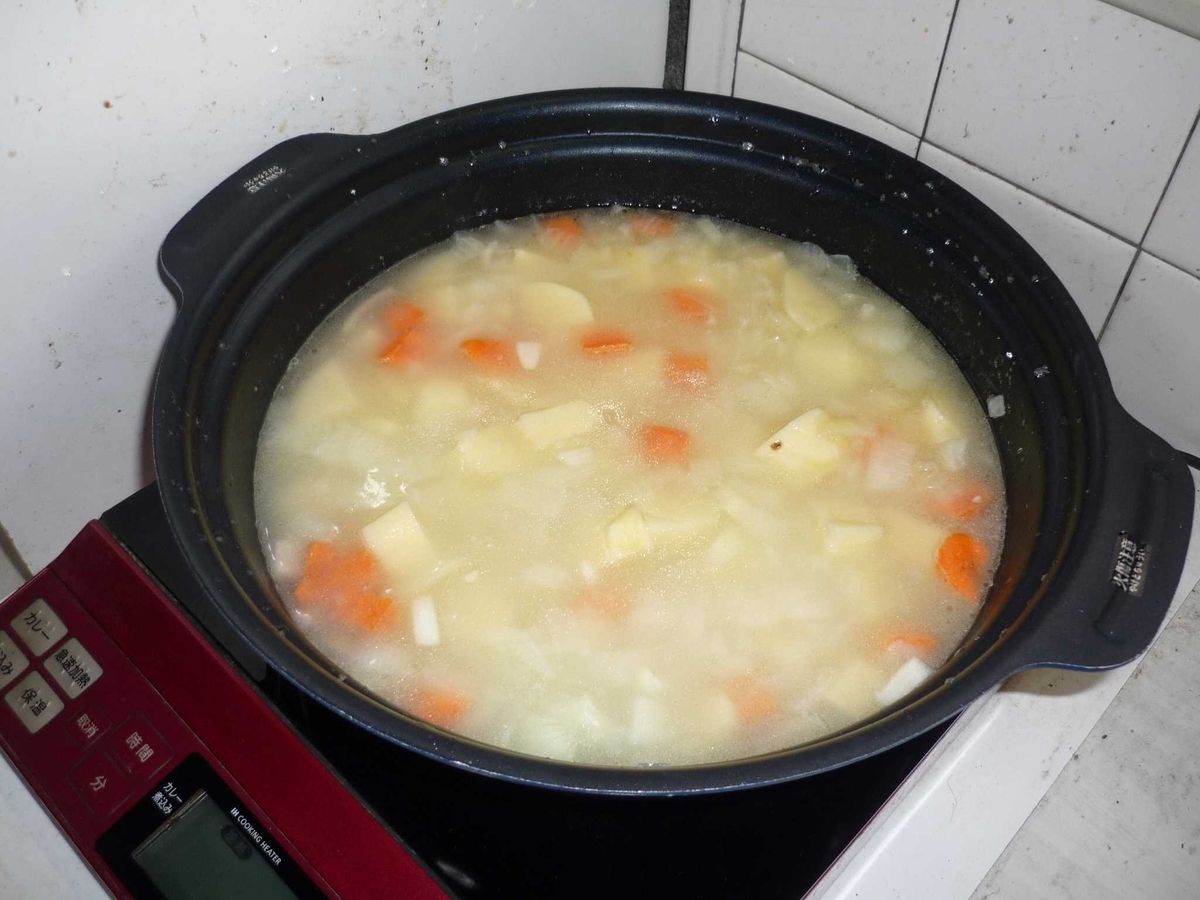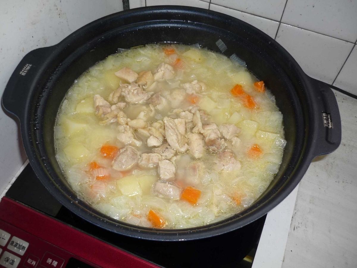 15分間ほど煮てジャガイモに串が通るようになったら最初に炒めた鶏肉を入れて煮込みを継続します。